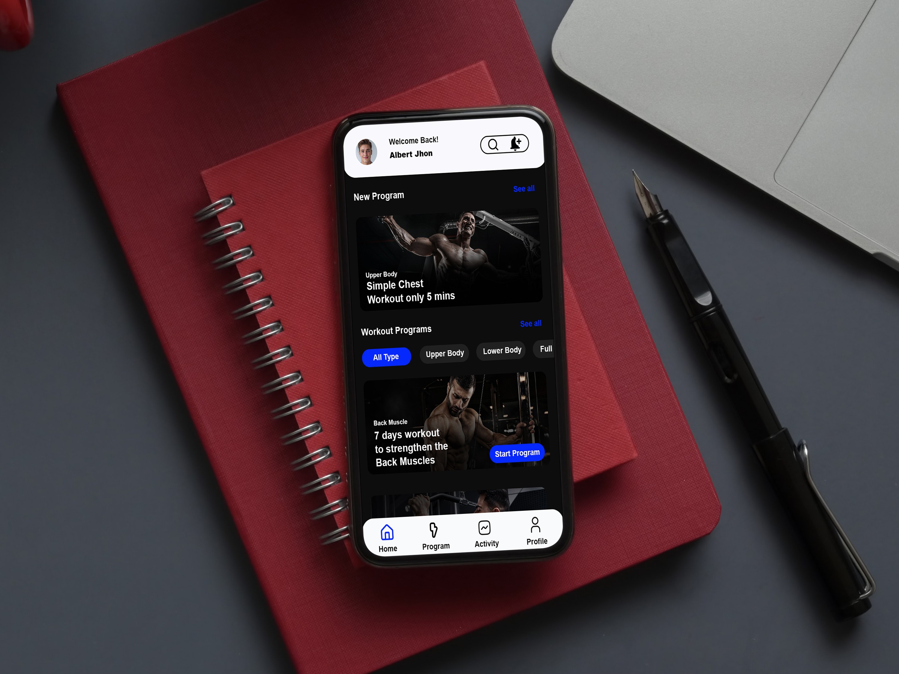 The mobile fitness app design features a sleek dark-themed interface with a personalized dashboard that greets users by name and highlights new workout programs. It offers quick-start routines like a “5‑minute chest workout” alongside structured plans such as a “7‑day back muscle strengthening” program. Clear categories for upper body, lower body, and full workouts make navigation simple, while visual thumbnails, time estimates, and calorie burn indicators keep users motivated. With an intuitive bottom navigation bar for Home, Program, Activity, and Profile, the app is built to deliver efficiency, clarity, and inspiration for anyone pursuing strength and transformation.