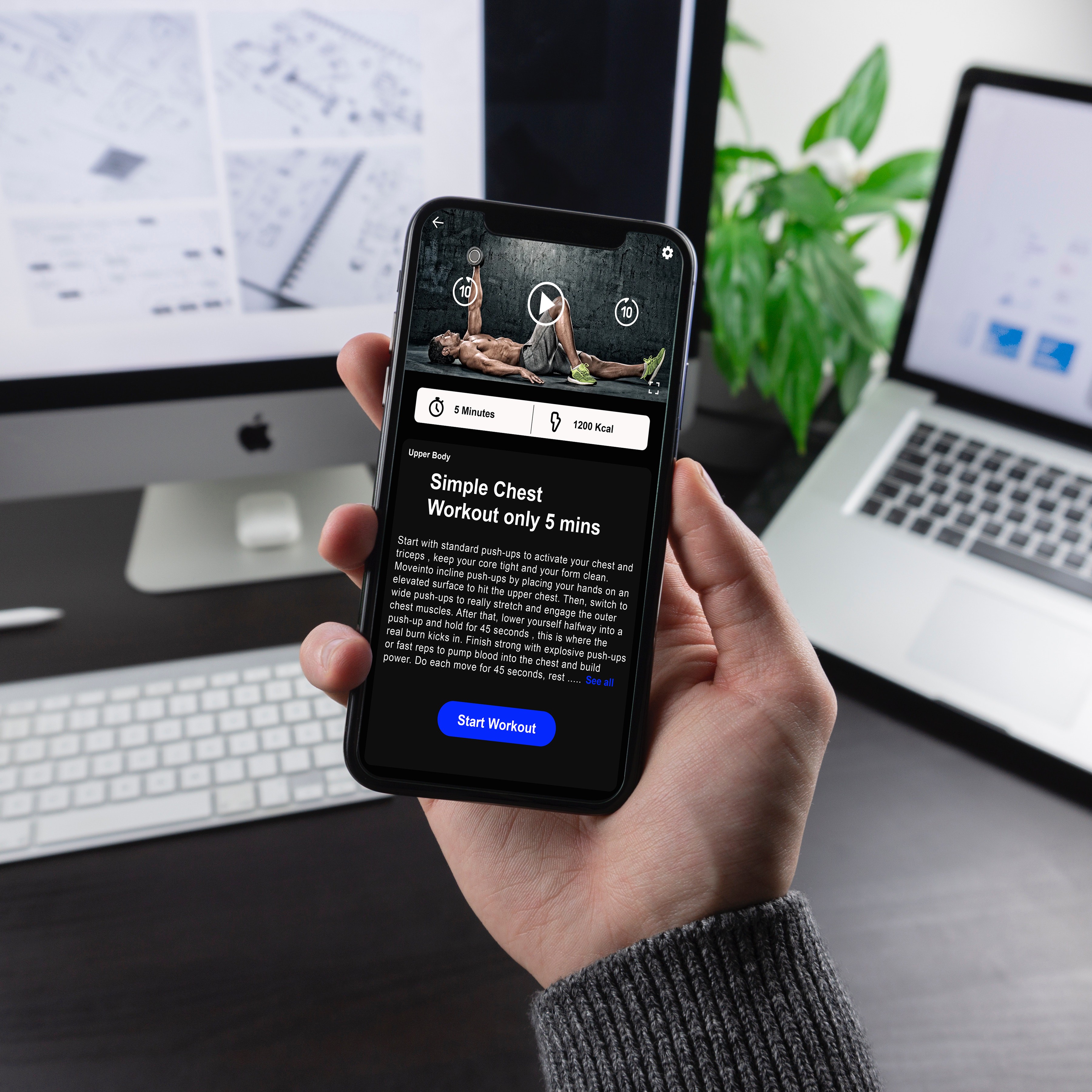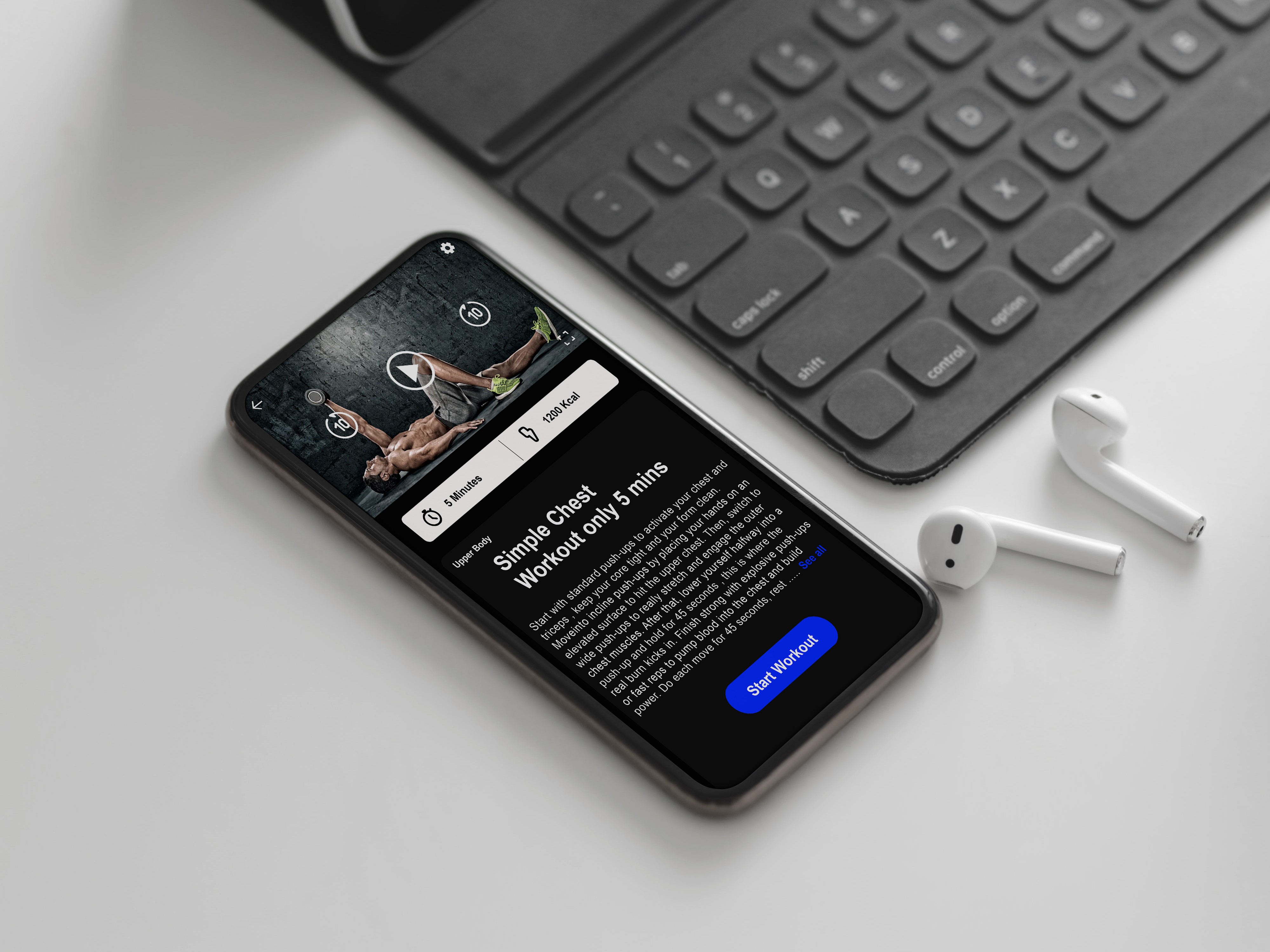 A sleek, dark-themed fitness app offering quick, targeted workout programs with intuitive navigation. Personalized dashboard and visual cues make training efficient, motivating, and easy to start